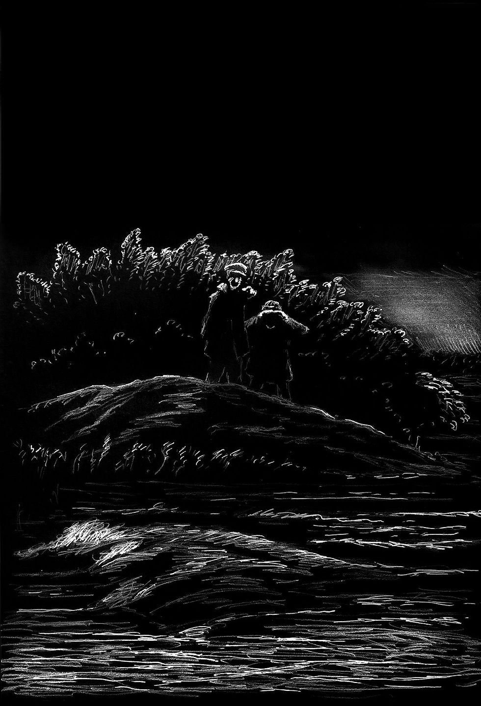 Sleep is difficult for them, and the narrator awakens to hear the telltale patterings of the Willow Things outside, along with a wild “torrent” of atonal humming rising up from the marshes. He notices that the Swede is missing and catches his friend standing by the rushing waters, prepared to hurl himself in.